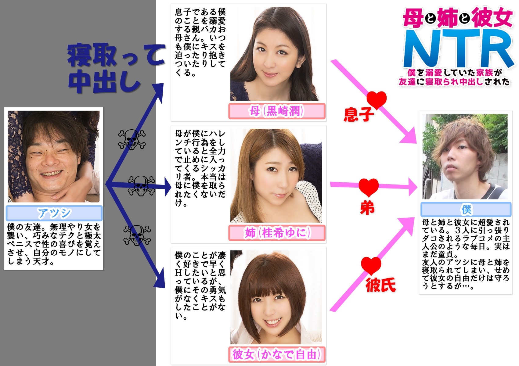 僕は母と姉と彼女にめちゃくちゃ愛されていて、いつも3人で僕を取りあっている。そんなある日、友人のアツシが僕の家に遊びに来た。僕の隙を見てアツシは母・姉・彼女に次々と手を出していく。僕は彼を止めることができず、激しい中出しSEXをただ見ていることしかできなかった。 / 母と姉と彼女NTR 僕を溺愛していた家族が友達に寝取られ中出しされた